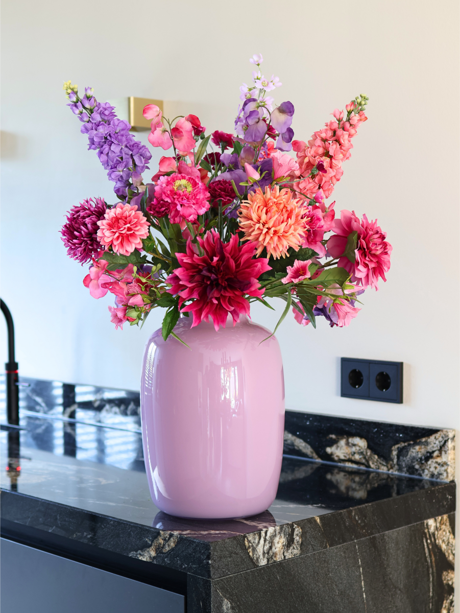 Wij hebben een prachtige selectie kunstbloemen boeketten samengesteld. Deze collectie is het resultaat van onze vakkennis en jarenlange ervaring. Dankzij onze expertise als bloemisten weten we precies welke kleuren goed bij elkaar passen en welke vormen kunstbloemen samen een prachtig geheel vormen. Op deze manier creëren we kunstbloemen boeketten die niet van echte boeketten te onderscheiden zijn, zodat je kunt genieten van prachtige bloemen in je interieur – zonder onderhoud.